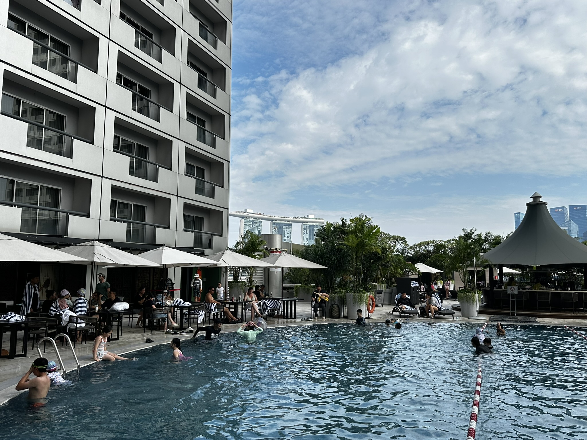 페어몬트와 스위소텔이 공동 운영하는 수영장은 사람이 많고 물이 차가워 아쉬웠습니다. 마리나베이샌즈가 보이는 전망은 좋았습니다.