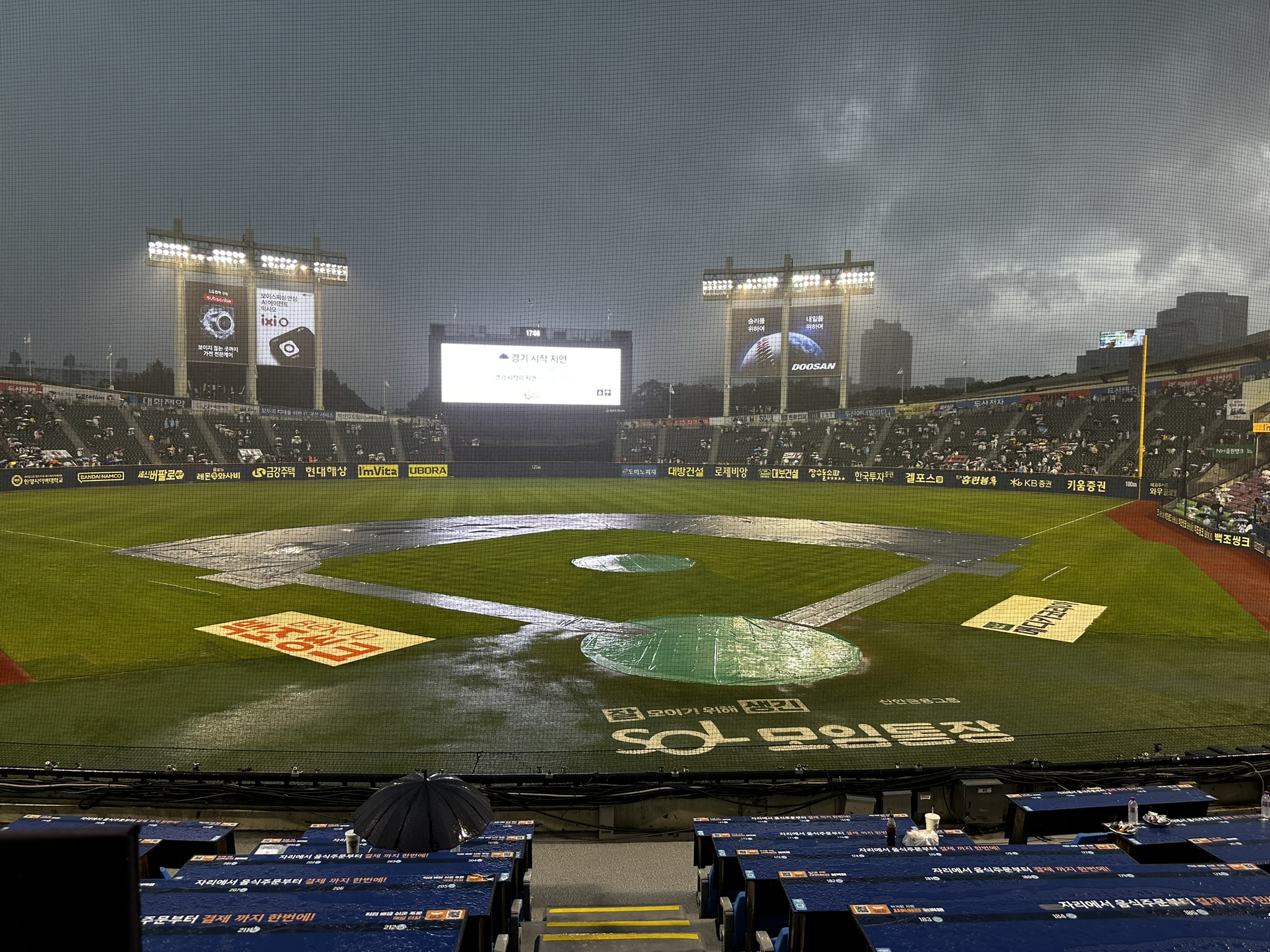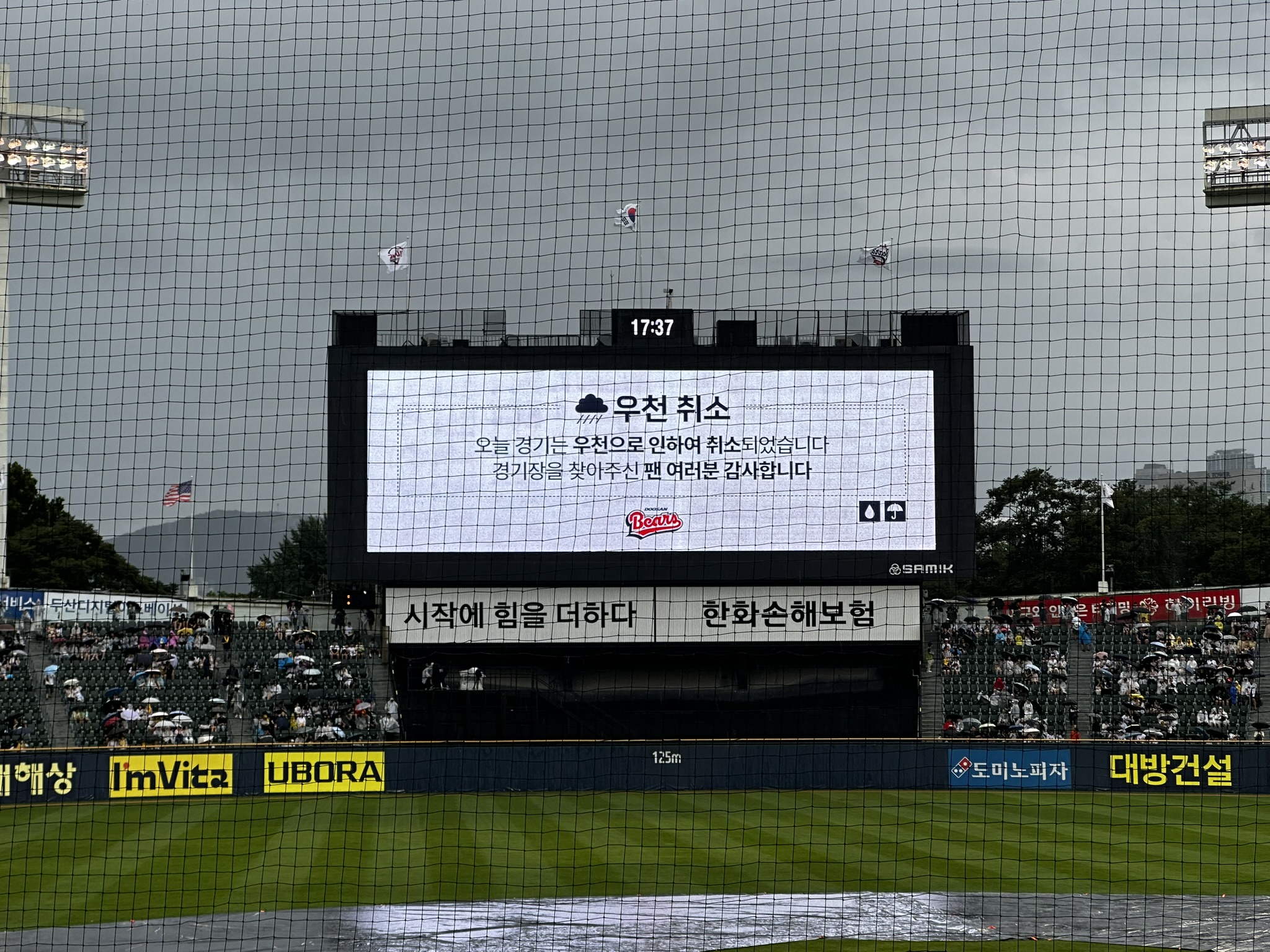 경기는 5시에서 6시 30분으로 연기된다는 반가운 소식이 들렸지만, 그 행복은 잠시였습니다. 또다시 빗줄기가 굵어지기 시작했고, 결국 경기는 우천 취소라는 아쉬운 소식을 전했습니다.