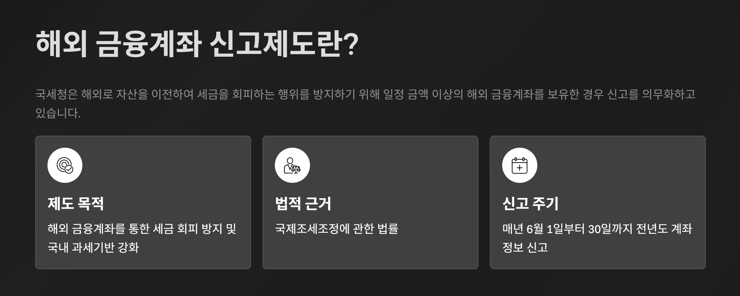 최근 정부는 해외 금융자산에 대한 모니터링을 강화하고 있으며, 각국과 금융정보를 교환하는 CRS(국제 공통보고기준)를 통해 해외 자산을 쉽게 파악할 수 있습니다. 따라서 자산을 해외에 보유하고 있다면 반드시 정해진 기간 내에 정확하게 신고하는 것이 중요합니다.