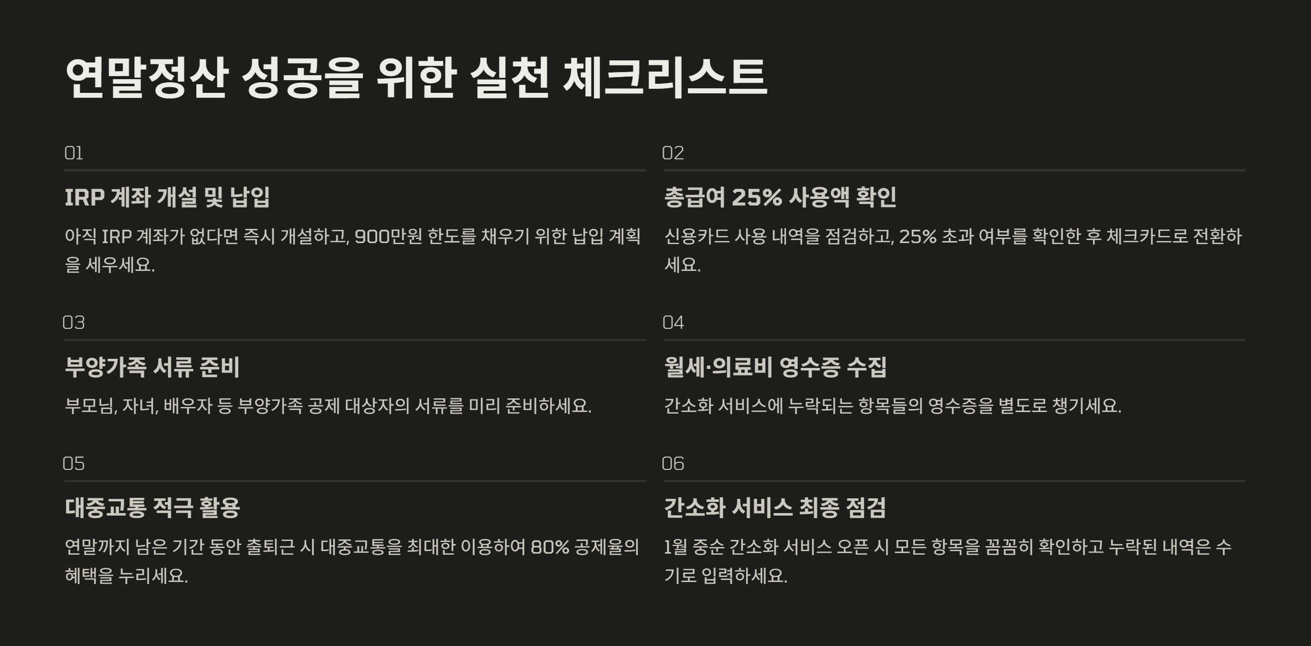 연말정산은 '세금 폭탄'이 아닌 '세금 환급'을 위한 전략입니다. 지금부터 꼼꼼하게 지출 내역을 확인하고, IRP 납입 한도를 채우며, 대중교통과 같은 고공제율 지출 수단을 활용하여 2025년 연말정산을 완벽하게 마무리하세요!
